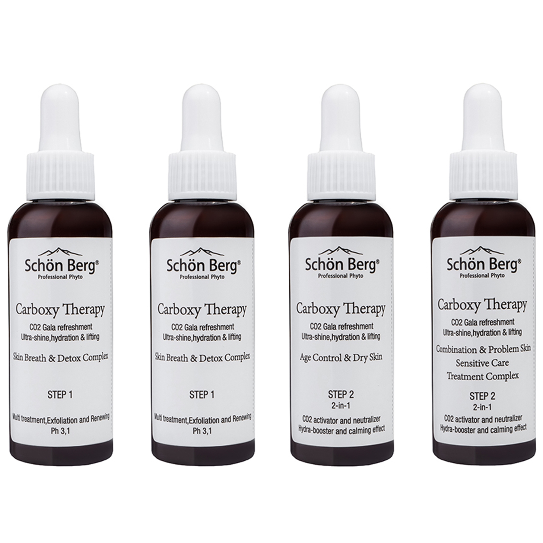 Apply simultaneously STEP 1 (3-5 ml) on the cleansed dry skin and STEP 2 (3-5 ml) according to the type of skin on face, neck and décolleté skin. Massage and flap the remaining substance till complete absorption and then thoroughly rinse with water. Apply serum according to the type of skin and mask AlgaMarine from Schön Berg or Regenerant Cream.